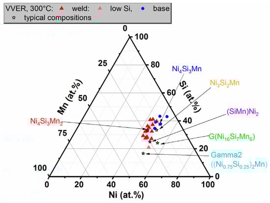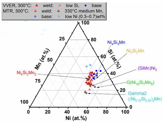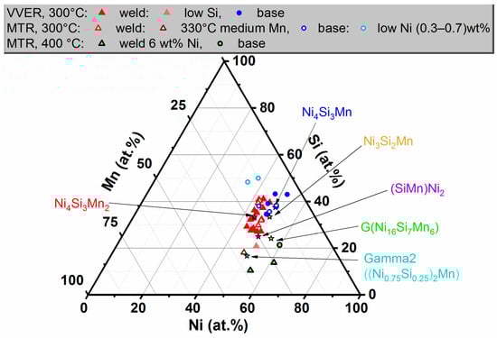 Figure 26 shows a ternary diagram in Ni-Si-Mn coordinates with the compositions of precipitates found in the steels irradiated at 400 °C and the compositions of NSM precipitates in the steels irradiated at 290–300 °C.