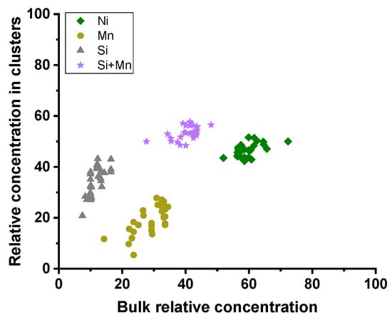 The composition of precipitates was estimated for the nucleus by the averaged IVAS cluster concentration profile. The study [] shows that the Fe content in precipitates does not exceed 6 at%, so the removal of the entire iron content from the precipitate composition is a reasonable assumption, although not quite physically correct. Therefore, only the precipitate-forming atoms (Ni, Mn, Si, Cu, and P) were considered when analyzing the findings.