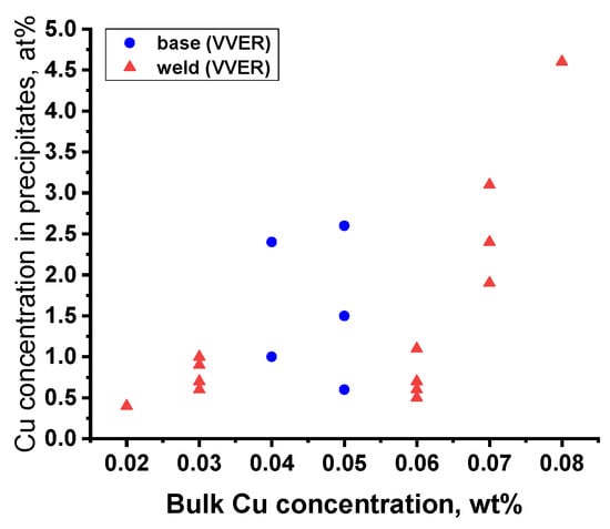 For high-Cu steels, copper-enriched precipitates were also detected in the state after long-term thermal conditioning at the irradiation temperature (after 45 years of operation). Comparison of the material after thermal conditioning with the same material exposed to irradiation at operating temperature for the same time shows the difference not only in the number, density, and size of precipitates (significantly lower values for thermal conditioning without irradiation) but also in the composition of the precipitates.