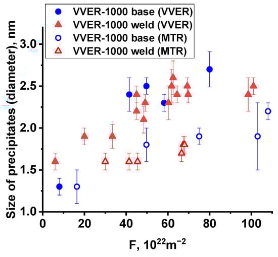 Table 3 shows that the number density of precipitates in high-Cu, low-Ni BM with Cu content of 0.11 wt.% is significantly lower than in high-Cu WM with Cu content of 0.16 wt.%, which is due to a higher Cu content in the latter. At the same time, the sizes of precipitates in BM with lower Cu content are higher. This is in agreement with the literature data [,].