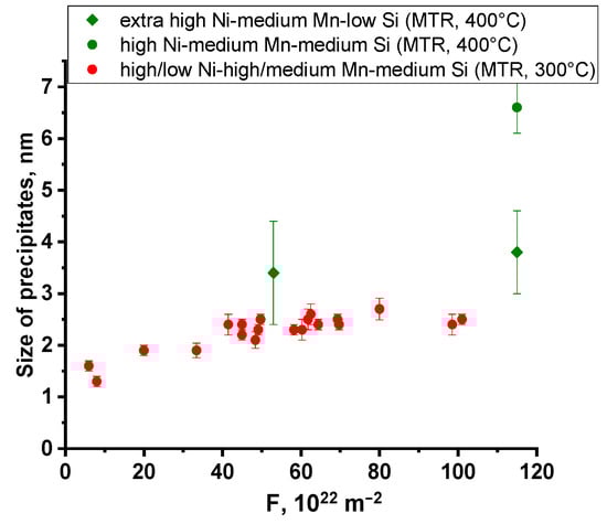 Precipitate sizes in high/low Ni, high/medium Mn, and medium Si steels as a function of fluence (F).
