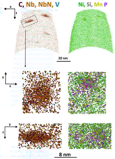The APT method allowed the detection of not only clusters in the volume but also segregation of elements on all features of the structure (dislocations, carbides/carbonitrides, and grain boundaries [,]), indicating a continuous process of solute precipitation at a high density of nucleation sites, triggered and maintained by continuous fluxes of vacancies and self-interstitials and their clustering due to irradiation. This mechanism differs from classical release by nucleation and growth.