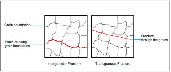 Schematics of the difference between intergranular and transgranular fractures.