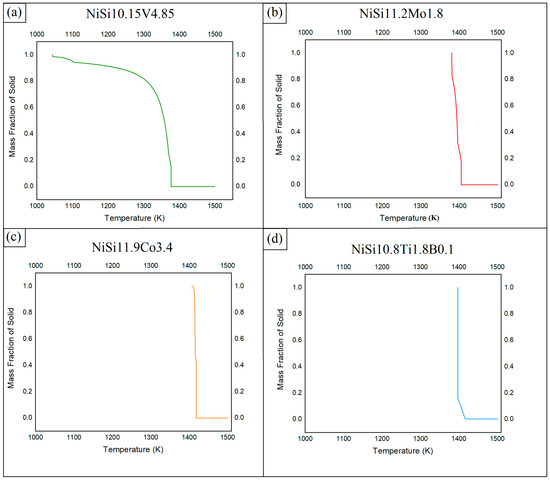 STR of (a) NiSi10.15V4.85 (NiSiV) wt%, (b) NiSi11.2Mo1.8 (NiSiMo) wt%, (c) NiSi11.9Co3.4 (NiSiCo) wt%, and (d) NiSi10.8Ti1.8B0.1 (NiSiTiB) wt% assessed using the Thermo-Calc software.