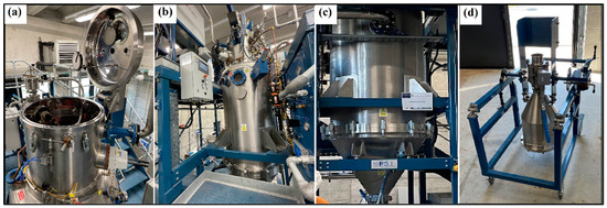 The gas atomizer (Hermiga 100/10 atomizer from PSI) used to produce the powder particles. (a) Melting chamber, (b) atomizing chamber view 1, (c) atomizing chamber view 2, and (d) powder collection unit.