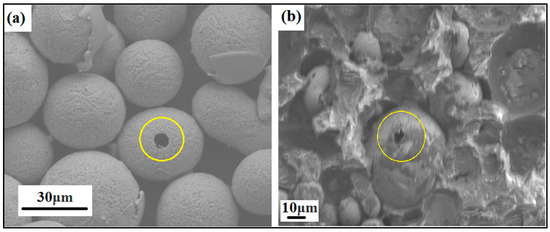 Even the porosity of the produced powder particles was analyzed in SEM by mounting the powders in ClaroCit, which is an acrylic resin (see Figure 6). Once cured, the samples were ground in Saphir 330 from ATM (Germany) using Struers silicon carbide (SiC) paper with 320 grit and 46 μm grain size.