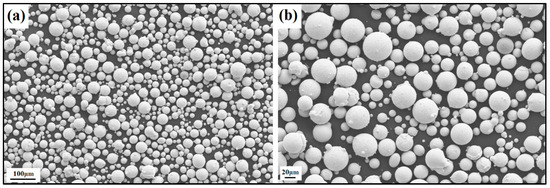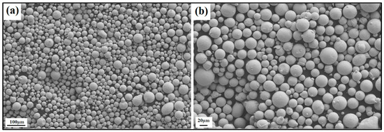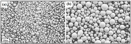 SEM image of the NiSiTiB (NiSi10.78Ti1.84B0.1 wt%) powder particles at the (a) 100 μm scale and (b) 20 μm scale.
