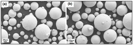 The produced powder particles, i.e., NiSiCo, NiSiMo, NiSiTiB, and NiSiV, were examined using SEM, and the secured micrographic images are presented in Figure 7, Figure 8, Figure 9 and Figure 10. During the SEM analysis, it was observed that a few satellite particles were present in all powders. However, the number of satellites was more pronounced in the case of the NiSiTiB and NiSiV powder particles (see Figure 9 and Figure 10), which can be attributed to the high atomizing pressure utilized during the production of these particles. The increased atomizing pressure is believed to have led to a turbulent flow within the atomization chamber, causing the collision of newly formed semi-solidified droplets with larger powder particles, resulting in the formation of satellite particles.