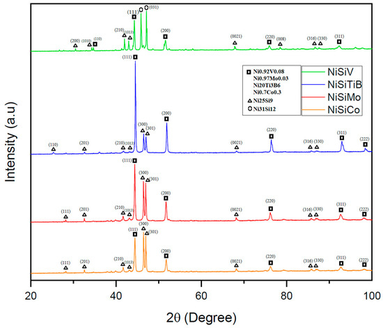 The performed XRD analyses revealed that the additional elements in each of the produced powders were detected in conjunction with the Ni; see Figure 12. It was also established that the produced samples exhibited similar crystal structures as the α-Ni phase, as well as the intermetallic Ni3Si phase (with lattice parameters of a0 = 3.519 and 3.506, respectively) [36]. Even the presence of the metastable Ni25Si9 phase was established, which is believed to have been formed due to rapid solidification/quenching. This is in line with what other researchers have indicated in the literature, i.e., that the formation of the metastable Ni25Si9 phase may occur during rapid quenching of the NiSi [37,38]. In other words, the alloying elements have, in this case, acted as grain refiners, resulting in a more complex microstructure.