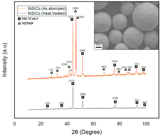 To further validate the hypothesis regarding the presence of the metastable phase Ni25Si9, the NiSiCo powder particles were subjected to heat treatment by raising their temperature to 600 °C and subsequently cooling. The XRD results of these particles—see Figure 13—clearly demonstrated the disappearance of the metastable phase, leaving only the Ni3Si phase present in the powders at room temperature. These findings confirmed the complex microstructure development in each of the systems investigated, as well as the presence of the metastable Ni25Si9 phase. In view of this, understanding these alloys’ phase transformations and behavior during heat treatment is crucial for optimizing their properties and, thereby, their performance in various applications.