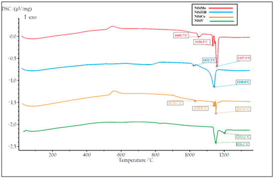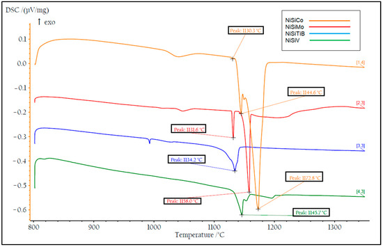In Figure 3, the STR of the most promising alloys assessed is presented, i.e., (a) NiSi10.15V4.85 (NiSiV) wt%, (b) NiSi11.2Mo1.8 (NiSiMo) wt%, (c) NiSi11.9Co3.4 (NiSiCo) wt%, and (d) NiSi10.8Ti1.8B0.1 (NiSiTiB) wt%. As can be seen from the figure, the alloys with additions of Ti, B, Co, and/or Mo solidify rapidly, whereas the alloys with additions of V undergo 85–90% solidification in a similar rapid fashion, but the process continues for another 200 °C until it finally solidifies completely.