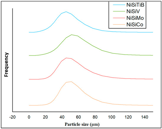 When comparing the obtained particle size distributions for the different powder particles presented in Figure 16, the peak for NiSiTiB shifts slightly to the left, indicating a minor increase in particle size within the 20–60 μm range. This shift is believed to be attributed to the higher gas atomization pressure used while producing these powder particles, as an increase in the gas atomization pressure tends to decrease the powder’s overall particle size. However, in the case of NiSiV, the higher gas atomization pressure resulted in an increased satellite formation, as previously mentioned; see Figure 9.