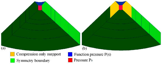 Considering the symmetry in the axial direction and radial direction of the three models, to save computation time, only 1/12 of the 3D finite element models were analyzed. As shown in Figure 3, all surfaces on the symmetric surfaces were controlled by a symmetrical boundary, and the contact surfaces between the divided bodies were applied only to the constraints of compression support. The pressure acting on the surface of the inner cavity was P0. The pressure acting on the conical surface of the cylinder was .
