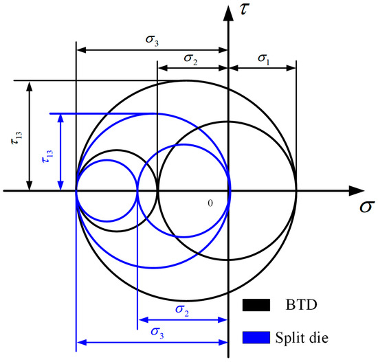 Compared with the BTD, excluding the significant reduction in the first principal stress, the third principal stress basically exhibited no change, while the second principal stress experienced a certain change. The three-dimensional Mohr stress circle is shown in Figure 10. The reduction in the first principal stress led to a significant reduction in the maximum shear stress. The von Mises stress of the MSSD gradually decreased from 6112 MPa (point 1) to 5645 MPa (point 2), and from point 2 to point 3, the value remained at approximately 5600 MPa, with a maximum shear stress of 3232 MPa. Both the von Mises stress and the maximum shear stress were much smaller than those of the BTD. According to the von Mises stress Equation (11), the change in the von Mises stress value of the MSSD was mainly caused by the change of the first principal stress. Therefore, due to the circumferential discontinuity, the MSSD can significantly reduce the first principal stress, reduce the maximum shear stress and von Mises stress, and significantly improve the pressure-bearing capacity.