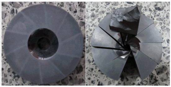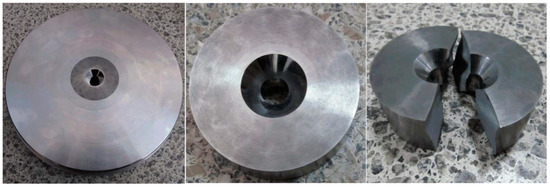 To confirm the failure mode and bearing capacity of the BTD, a corresponding die was designed and processed according to the dimensions exhibited in Figure 2. The cylinder was made of YG8 carbide, and the outer supporting ring was made of 45CrNiMoVA high-strength steel. The sample subjected to experimentation was made of pure iron. A hydraulic press was used to carry out the experiments and the oil pressures were read when the dies fractured. Figure 7 presents the diagram of the die after destruction. When the oil pressure was 7.2 MPa (the bearing load was 564.5 KN), the belt cylinder burst upward, which is consistent with the theoretical analysis results. Therefore, it can be determined that the overall belt cylinder contributed to an excessive first principal stress, which then led to circumferential cracking damage.