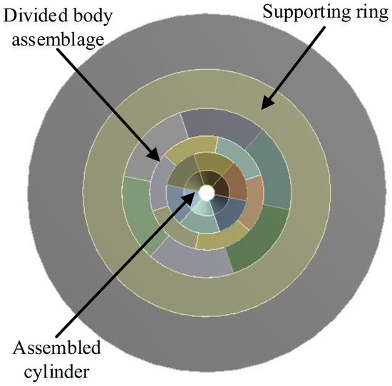 From the previous subsection, it can be seen that the main failure of the BTD is caused by excessive circumferential stress. Even if the supporting ring provides sufficient external support force, it cannot prevent the radial failure of the inner wall of the pressure cylinder. Therefore, to avoid the disadvantage of a large circumferential tensile stress of the BTD, the concept of a discretized cylinder is proposed through reducing the circumferential tensile stress of the cylinder and increasing the cavity pressure. The discretized cylinder is not continuous in the circumferential direction, which can reduce both the circumferential stress and the shear stress. The designed multilayer stagger-split die (MSSD) is depicted in Figure 8. When the pressure on the inner wall of the cylinder is transmitted radially, the supporting ring bears a large amount of pressure. The discrete supporting ring can gradually reduce the pressure while ensuring safety. The pressure ultimately transmitted to the outer supporting ring is significantly reduced, thus improving the safety and stability of the die. The common feature of the design of the MSSD and the BTD is that, of the entire die, the pressure cylinder is the first component of the entire die to be damaged. Therefore, the stress and damage characteristics of the cylinder are mainly analyzed in this section.