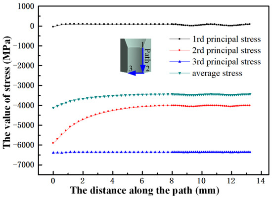 Figure 5 shows the three main stresses , and the average stress , along the path of the belt cylinder under the application of 6500 MPa of force to the inner wall of the cylinder. As shown in the figure, the cylinder of the BTD was a continuous whole in the circumferential direction. Therefore, the first principal stress of the belt cylinder was very large and gradually increased from 1655 to 3506 MPa, after which it remained unchanged. The second principal stress gradually increased from −5767 to −3047 MPa and then remained unchanged. The third principal stress was approximately −6400 MPa, which was basically equal to the pressure applied to the inner wall of the cylinder.