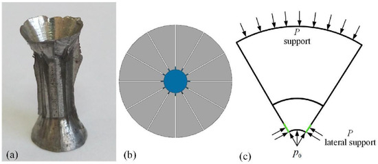 To further improve the bearing capacity of the radial split cylinder, two types of cylinders with positive polygonal cavities were designed, as shown in Figure 13. The first cylinder was a radial split cylinder, but the front face of the sector block was changed from a circular arc to a plane, and the cavity was changed from a cylindrical surface to a regular polygon. The radial split cylinder will produce a certain amount of radial displacement after being stressed, and the outer supporting ring will provide a lateral support force. Therefore, a second radial split cylinder with a regular polygon cavity was designed. The numerical simulation and experimental results revealed that the pressure-bearing capacities of these two types of cylinders were slightly improved as compared to that of the original radial split cylinder, but the improvement was insignificant. The pressure-bearing capacity was improved because the first principal stress of the regular polygon cavity was slightly lower than that of the radial split cylinder, resulting in the reduction in the maximum shear stress and von Mises stress. However, this type of cylinder still has the disadvantage of a radial split cylinder, which means the cylinder will be in a tensile state after being subjected to force, thus limiting the continued increase in pressure.