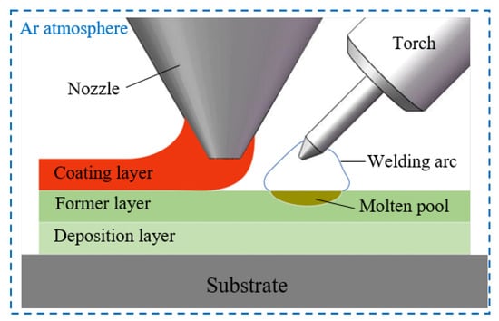 A schematic diagram of the local forming area of the fused coating is shown in Figure 2. The molten aluminum alloy flows out of the nozzle and then spreads around under the squeeze of the nozzle until it is completely solidified. The 3D motion platform moves according to the layered trajectory of the processed parts. After the current layer has been deposited, the 3D motion platform descends by one layer and begins processing the next layer. In order to achieve metallurgical bonding between adjacent deposition layers to improve interlayer bonding strength, the AC pulse TIG arc is used for preheating.