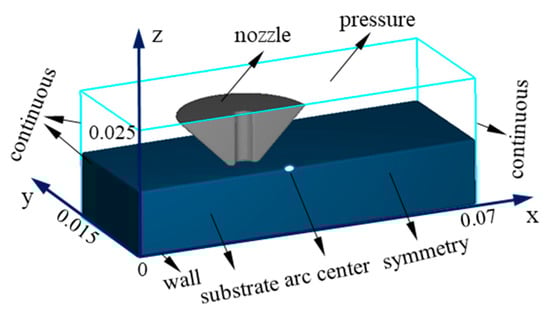 The numerical analysis model and boundary conditions are shown in Figure 3. Flow-3D is based on the finite-difference method and meshes the entire computing domain rather than individual components. For a clearer representation of the model, the spatial mesh is hidden. The upper boundary is set as the pressure boundary, and a fluid source phase is set at the upper boundary, which can continuously provide high-temperature aluminum alloy melt for the coating nozzle. The model adopts relative pressure, so the atmospheric pressure was set to zero. Due to the symmetry of the model, the XOZ plane is set as the symmetric boundary. The bottom boundary is set as a wall, and the remaining boundaries are set as continuous boundaries. The pulse frequency of the welding machine current is 5 Hz, and the base current and peak current are 120 A and 200 A, respectively. The nozzle temperature is constant at 973 K, while the initial temperature of the substrate and the ambient is 298 K.
