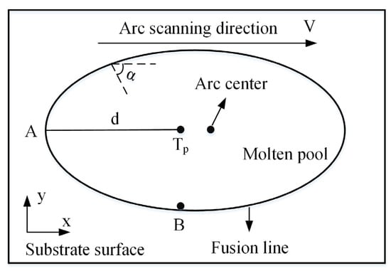 During the arc preheating process, the movement direction of the solidification front of the molten pool always follows the maximum thermal gradient direction perpendicular to the solid−liquid interface. The temperature gradient varies at various points on the fusion line and the solidification rate at the solid−liquid interface in the stable section can be defined as []: