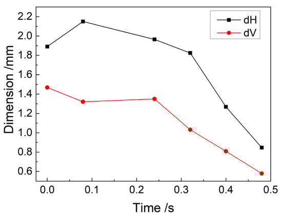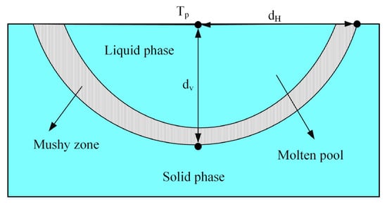As shown in Figure 6, dH and dV are the distances from the molten pool center along the horizontal plane and the vertical plane to the boundary, respectively. Then, the solidification velocity in the horizontal and vertical directions can be expressed as: