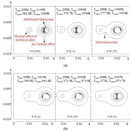 In Figure 7, Tmin is the overall lowest temperature, Tmax is the highest temperature overall, Tcmin is the lowest temperature of the isotherm, and Tcmax is the highest temperature of the isotherm. The red words in the Figure 7a are the explanation of the contour in the corresponding position. It can be seen from Figure 7 that the temperature field of the upper surface of the substrate is mainly affected by two parts: the metal melt flowing out of the coating head and the arc heat source. The blank part of the molten pool is caused by the concave surface of the molten pool caused by the arc pressure.