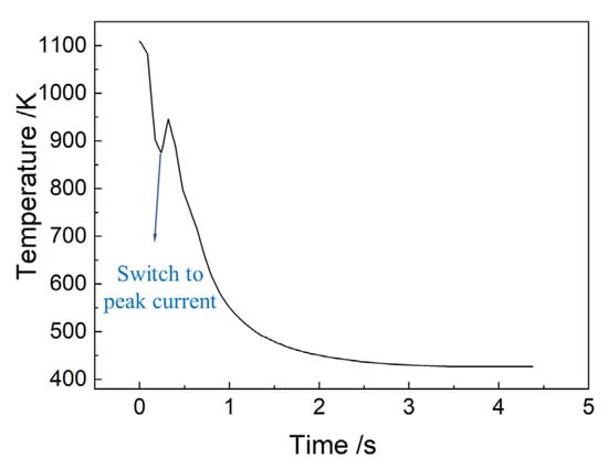 The surface of the molten pool in Figure 6d and Figure 8c is significantly higher than that of the substrate due to the continuous forward movement of the welding arc. During the peak current period, the molten pool is concave under the action of the arc forces, and the fluid in the molten pool is pushed to the rear. The variation curve of dH and dV with time from the highest temperature point to solidification in the molten pool obtained through software postprocessing is shown in Figure 9. The cooling curve of Tp point is shown in Figure 10.