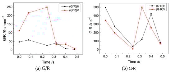 The sudden increase in temperature at the molten pool center in Figure 10 is caused by the switching of the welding current from the base current to the peak current. According to Figure 9 and Figure 10, the values of G/R and G·R at the fusion line of the molten pool at different times in the horizontal and vertical directions were calculated, and the results are shown in Figure 11.