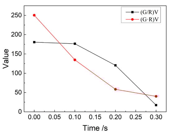 Since the values of dH, dV, and Tp were not monotonic over time, the values of G and R fluctuated all the time. As a result, the G/R and G·R values in Figure 11 were not monotonic, either. Using the same calculation method, the values of G/R and G·R during the solidification process of a single fused-coating layer can be obtained. The time when the coating layer begins to solidify is set to be the initial moment, and the result is shown in Figure 12.