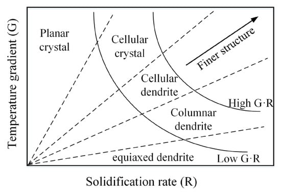 Temperature gradient and solidification rate play an important role in the microstructure morphology of the aluminum alloy after solidification. Usually, the G/R controls the solidification mode, while G·R governs the scale of solidified microstructure. As shown in Figure 11, when the solidification rate is low and the temperature gradient is high, it tends to generate planar crystals during the solidification process. When the curing rate increases and the temperature gradient remains high, there is a tendency to form cell crystals that regenerate into dendrites during the curing process. When the temperature gradient is low, columnar or equiaxed crystals will be generated during the solidification process. In short, an increase in the G·R value represents an increase in cooling rate and a gradually finer microstructure.