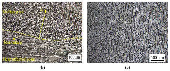 The preheated molten pool is cut along the cross-section using wire cutting after solidification. Then the molten pool area is ground using 800 mesh, 1000 mesh, and 1500 mesh sandpaper in sequence and corroded using Keller’s reagent. The microstructure of the junction area between the bottom of the melt pool and the heat-affected zone (zone 1) and the upper area of the melt pool (zone 2) is shown in Figure 14.