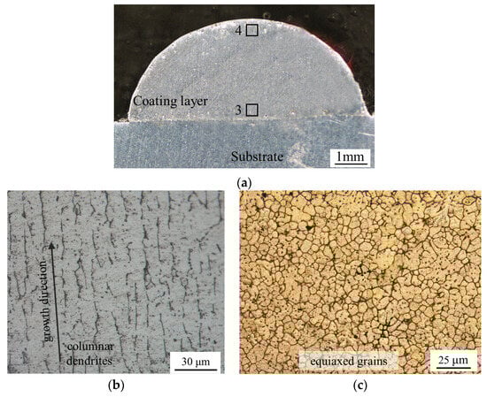 Microstructural morphology of different areas inside the coating layer. (a) Observation of the position of the microstructure of the coating layer. (b) Microstructure morphology of zone 3. (c) Microstructure morphology of zone 4.