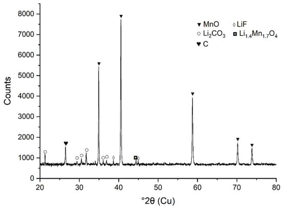 The chemical composition reveals that it is an LMO battery owing to its high Mn content and much lower Co and Ni contents. Figure 1 shows the phases found in the pyrolyzed black mass by XRD.