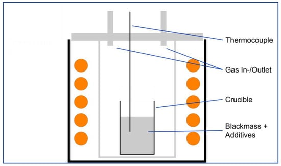 The pyrolyzed black mass was mixed with the reactants at a given mass ratio for the trial. Both reactants, CaCO3 and CaSO4, are in chemical grade from Sigma-Aldrich. CaSO4 has a particle size of 44 μm and a purity of 99% (Sigma Aldrich SID 329752446, Darmstadt, Germany). CaCO3 has a particle size of 44 μm and a purity of >99.0% (Sigma Aldrich SID 329752519, Darmstadt, Germany).