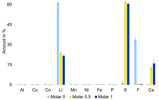When the results are grouped by the molar fraction, the following effects on the fluoride ions in the solution are evident: As shown in Figure 4, Li was co-distributed with F in the filtrate when only CaCO3 was present. In comparison, when CaSO4 was used, S and Ca were present; however, F decreased significantly. This leads to the assumption that CaSO4 reacts with LiF and fixes it as CaF2, which is an insoluble compound. When using a sample with both CaCO3 and CaSO4, dissolution of S and Ca was also observed, whereas dissolution of Al, Cu, Co, Mn, Ni, Fe, and P was minimal in all cases.
