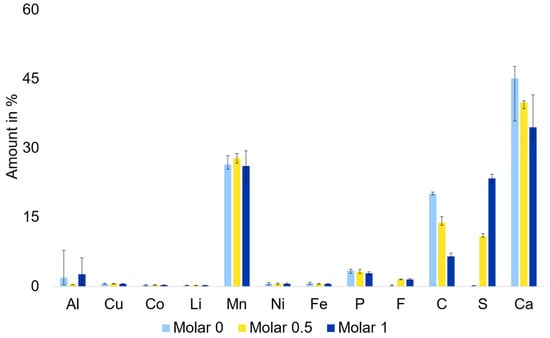 The selectivity factor (SF) represents the leached amount of an element relative to the leached amount of Li. Thus, it determines the purity of the resulting aqueous solution []. Higher SF values indicate greater selectivity. Regarding LiB recycling, some authors state that their processes are selective but do not quantify it [,,,,]. Across all the main trials, the SF values for Al, Cu, Co, Mn, Ni, Fe, and P fell within the range of 128 to 142. The SF values for S, F, and Ca are listed in Table 7 and sorted by molar fraction. For molar fractions of 0.5 and 1, the SF values for S ranged from 34 to 40, while the SF values for F ranged from 24 to 65. The SF values for Ca in these molar fractions are very low, ranging from 1 to 2. At a molar fraction of 0, the SF value for F is low (approximately 1.8). Conversely, the SF value for Ca in molar fraction 0 ranged from 129 to 138, which was similar to the SF values of other impurities across all molar fractions. As no S was added to molar fraction 0, the SF value for S was high.