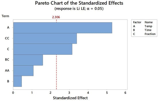 The Pareto chart is a valuable tool for examining the statistically significant terms and their relative magnitudes within the model. Figure 6 presents the Pareto chart corresponding to the model, with Li LE as the response variable, where any bar surpassing the red-dotted line indicates statistical significance with a p-value less than 0.05. Notably, temperature, molar fraction, and the squared term of the molar fraction emerged as three statistically significant terms. Among these terms, temperature exerted the most substantial influence on the model. The molar fraction and squared molar fraction exhibited comparable impact magnitudes, albeit slightly lower than temperature. This Pareto analysis offers valuable insight into the relative significance of each term within the model.
