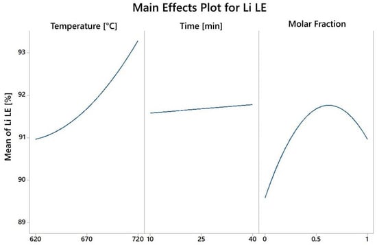 The main effects quantify the contribution of each factor to the mean response of Li LE. Figure 7 illustrates the main effect plots. An increase in the temperature was observed to positively influence the response. In contrast, the impact of the holding time on the response is relatively minor, as depicted by the small bar in Figure 6. The molar fraction exhibited a parabolic effect on the response. Specifically, the response was lowest when only CaCO3 was present, whereas the highest response was achieved when a mixture of both reactants was used.
