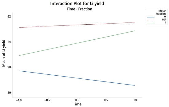 Interaction plots revealed the relationships between different factors. In the model, the interaction between time and molar fraction, labeled Time·Fraction, remains significant. Figure 8 depicts the interaction plot between time and molar fraction. It can be observed that the impact of the molar fraction becomes more pronounced with longer holding times. Specifically, when only CaSO4 was present, time had a positive effect on mean Li LE. Conversely, when only CaCO3 is used, the effect is negative. However, when a molar fraction of 0.5 is employed, the effect becomes negligible.