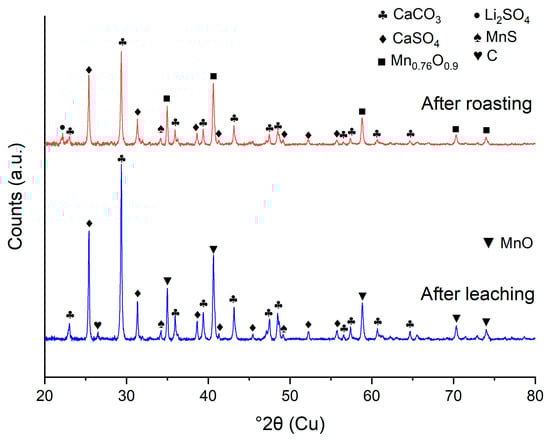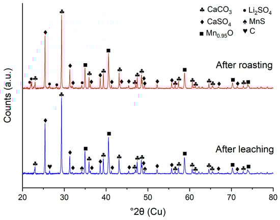The XRD patterns for two experiments after roasting and after leaching are shown in Figure 9 and Figure 10. Equimolar amounts of CaSO4 and CaCO3 were used in these experiments. Both agents remained unreacted, allowing the possibility of decreasing their quantity in further studies. In both cases, Li2CO3 was not identified, indicating the transformation of Li2CO3 to Li2SO4. Furthermore, when CaSO4 is used, MnS can be produced in parallel at both temperatures and is only identified after leaching. Furthermore, C was not detected in the diffractogram before leaching because its share was below the 5 wt.% required by the software HighScore (version 4.9) to be identified. After leaching, Li2SO4 was completely dissolved, as were, to some extent, CaSO4 and CaCO3, which are slightly soluble in water. The main difference between the two experiments was the type of Mn oxide detected, although their oxidation states were similar.
