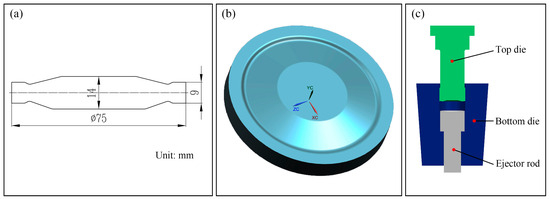 Schematic diagram of the formed part and assembly diagram of dies. (a) Two-dimensional drawing of the formed part; (b) three-dimensional model of the formed part; (c) assembly drawing of the forming dies.