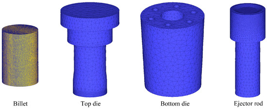 The billet (Ø35 mm × 52.5 mm) and dies were meshed, and the mesh generation results are shown in Figure 2. The relative grid division method was adopted for meshing the top die, bottom die, and ejector rod. The grid in the region where the die and the billet directly contacted was smaller, while the grid size in other positions was relatively large. The number of grids for the top die, the bottom die, and the ejector rod was 80,000, 45,000, and 50,000, respectively. As for the billet, it was meshed by the absolute grid division method; the minimum grid size was 0.4 mm, and the number of grids was 100,000.