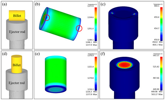 When the billet was placed on the ejector rod, the top die started to go down, and the billet was in contact with the ejector rod for a period of time before the top die came into contact with the upper surface of the billet. For the accuracy of the numerical simulation of the whole process, the heat transfer between the billet and the ejector rod should also be considered. In this work, the contact time between the billet and the ejector rod was set as 2 s, the heat transfer coefficient was set as 1 kW/(m2·K), the initial temperature of the ejector rod was set as 450 °C, and the initial temperature field distribution of the billet was the result in Section 3.1. Because the placement mode of the billet affected the contact area between the billet and the ejector rod, a comparative analysis was carried out in the simulation. The schematic diagram of the horizontal placement of the billet is shown in Figure 5a, and the schematic diagram of the vertical placement of the billet is shown in Figure 5d. First, the heat transfer of the billet in horizontal placement was simulated, and the results are shown in Figure 5b,c. It can be found that when the billet was placed horizontally, the contact position between the billet and ejector rod was two contact points (as shown in the red circles in Figure 5b), and there was a significant temperature change at these two points. The temperature at the contact point of the billet decreased significantly, which was 1248.1 °C, while the temperature at the contact point of the ejector rod increased slightly, which was 464.1 °C. When the billet was placed vertically, the simulation results are shown in Figure 5e,f. It can be seen that when the billet was placed vertically, the whole bottom surface of the billet was completely in contact with the ejector rod, so there was obvious heat transfer at the location of the contact surface. As shown in Figure 5e, the temperature of the contact surface of the billet was significantly reduced, and the temperature of 1216.3 °C at the circumference of the bottom surface was the lowest. As shown in Figure 5f, the temperature at the contact surface of the ejector rod was also significantly increased, and the temperature of 563.2 °C at the center was the highest.