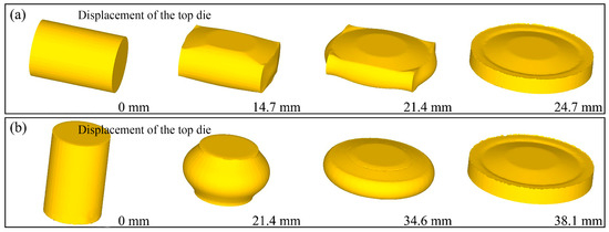 The forming process of the billet with different placement modes. (a) Horizontal placement; (b) vertical placement.