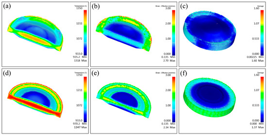 Simulation results of the billets with (a–c) horizontal placement mode and (d–f) vertical placement mode. (a,d) Temperature field; (b,e) effective strain field; (c,f) damage field.