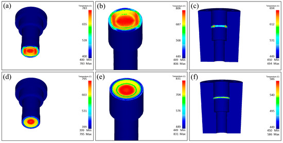Figure 8 shows the temperature field distributions of the dies with different billet placement modes. Figure 8a–c shows the temperature field distribution of the top die, ejector rod, and bottom die when the billet was placed horizontally. It can be seen that when the billet was placed horizontally, due to the uneven flow of the billet, the mold temperature distribution was also nonuniform. The highest temperature of the top die was 783 °C, the highest temperature of the ejector rod was 806 °C, and the highest temperature of the billet was 694 °C. Figure 8d–f shows the temperature field distribution of the top die, ejector rod, and bottom die when the billet was placed vertically. As the billet flowed uniformly along the circumference during the forming process, the temperature field distribution of the dies was also distributed along the circumference. As shown in Figure 8d–f, the highest temperatures of the top die, ejector rod, and bottom die were 795 °C, 831 °C, and 586 °C, respectively. By comparison, it can be found that the maximum temperatures of the top die and ejector rod were lower when the billet was placed horizontally than when it was placed vertically. This is mainly because when the billet was placed horizontally, the deformation of the billet in the vertical direction was smaller, and the heat transfer time between the billet and the dies was less with the same extrusion velocity. When the billet was placed vertically, the billet filled the circumferential position at last, so the die temperature was lower.