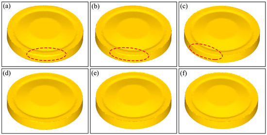 Figure 9 shows the three-dimensional morphologies of the formed parts with different billet temperatures. As shown in Figure 9a–c, when the billet temperatures were 1250 °C, 1300 °C, and 1350 °C, the outer edge of the formed parts was not completely filled (as shown in the red dotted box in Figure 9). As shown in Figure 9d–f, when the billet temperatures were 1360 °C, 1370 °C, and 1380 °C, the formed parts were completely filled. The simulation results indicated that the billet temperature had a significant effect on the filling performance of the formed parts. When the billet temperature was high enough, the flow performance of the formed part was good, and the formed part could be completely filled.