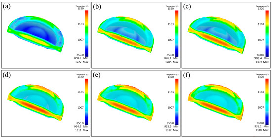Temperature field distribution of the formed parts with different billet temperatures. (a) 1250 °C; (b) 1300 °C; (c) 1350 °C; (d) 1360 °C; (e) 1370 °C; (f) 1380 °C.