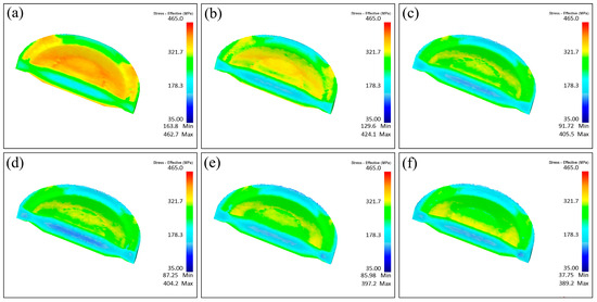Equivalent stress field distribution of the formed parts with different billet temperatures. (a) 1250 °C; (b) 1300 °C; (c) 1350 °C; (d) 1360 °C; (e) 1370 °C; (f) 1380 °C.